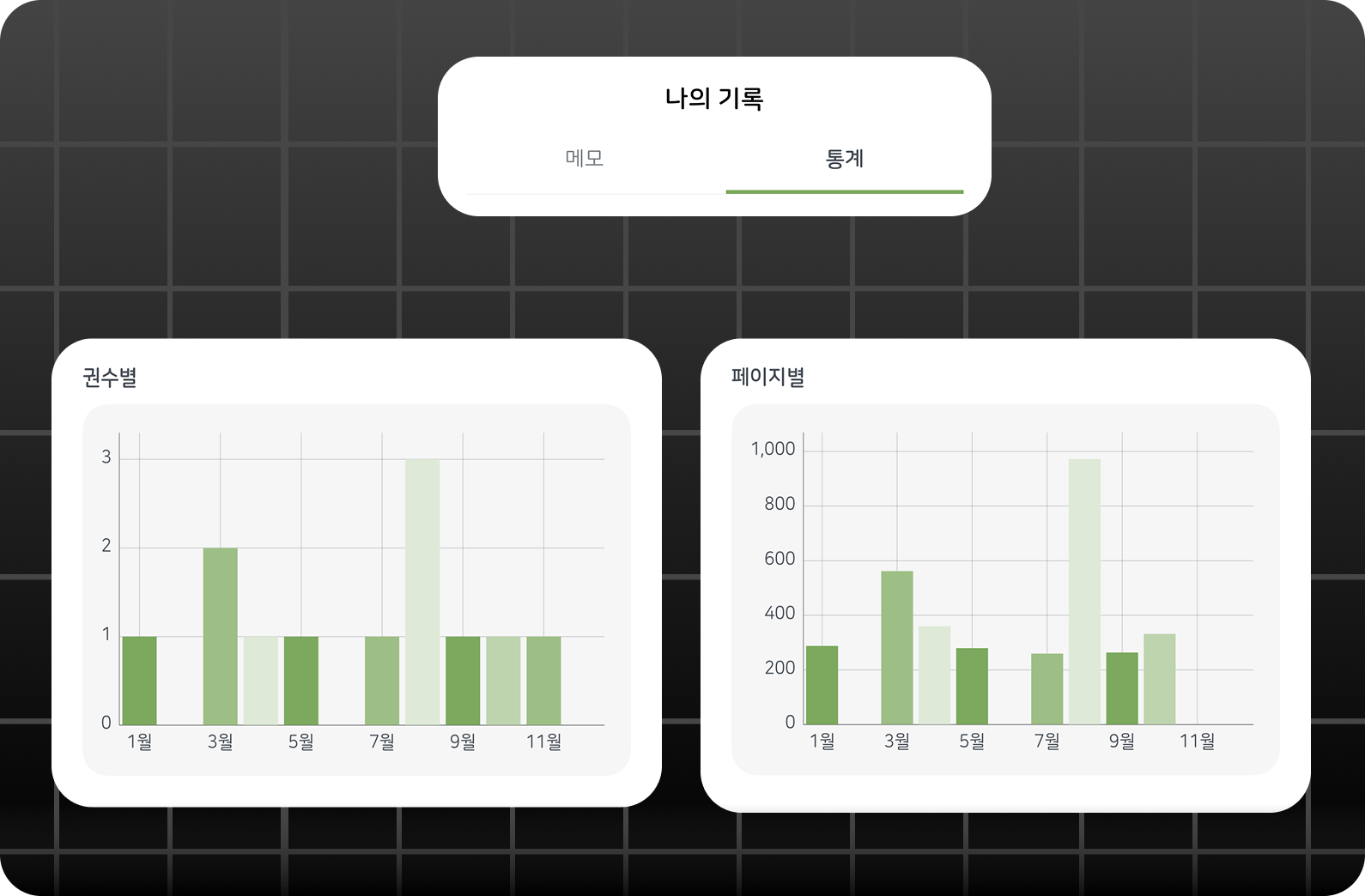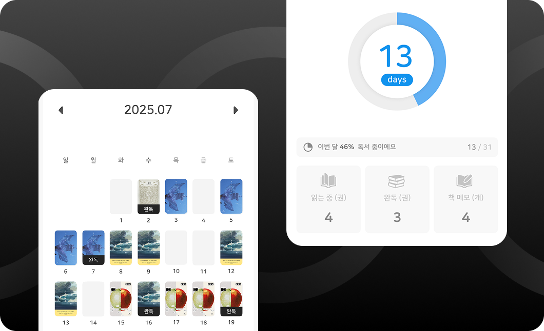 하단의 상태창은 한 달간의 독서 기록을 한눈에 보여줘요.