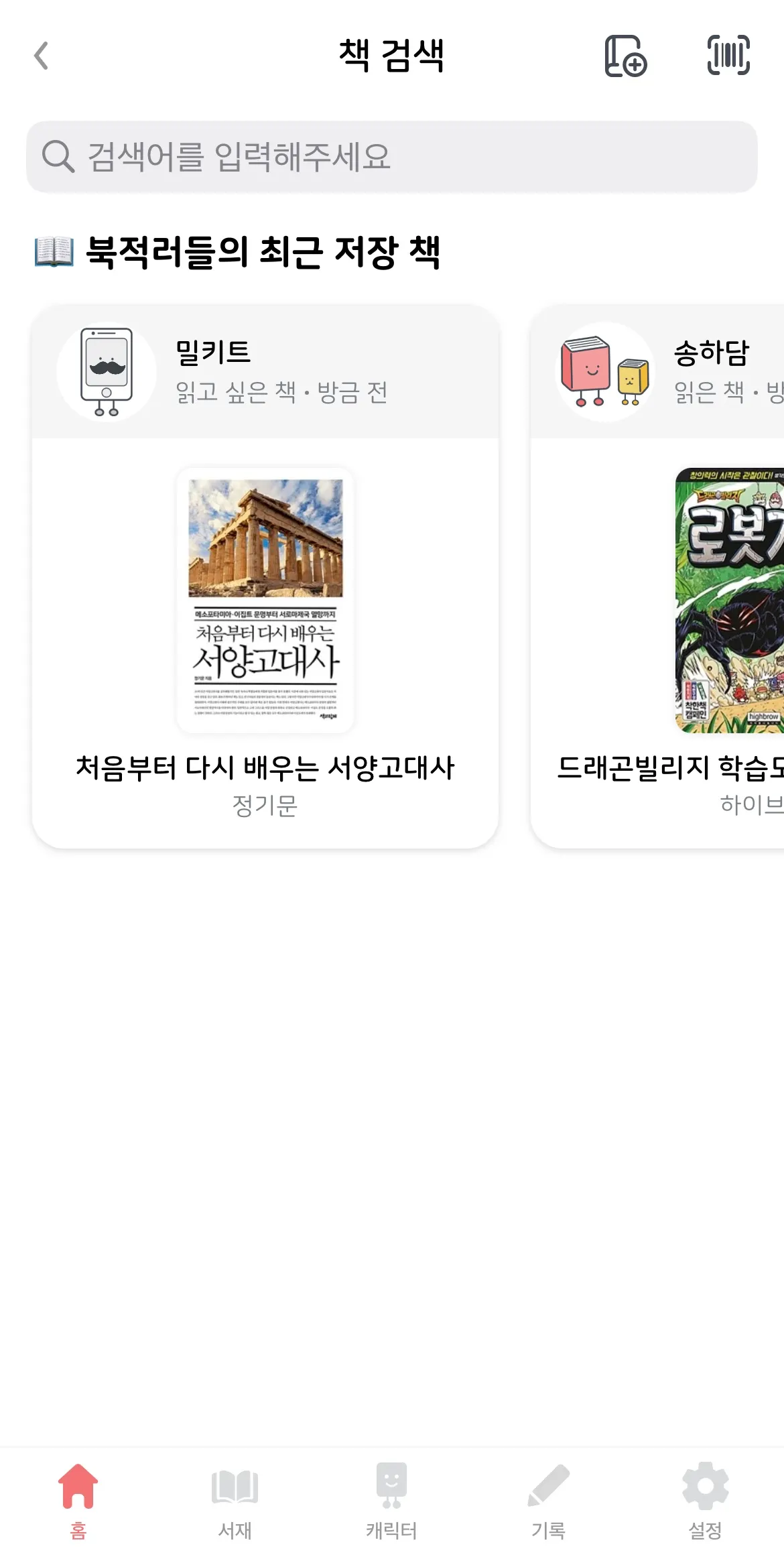 북적이 캐릭터는 홈 화면의 쌓아보기 화면에서 만나볼 수 있어요.