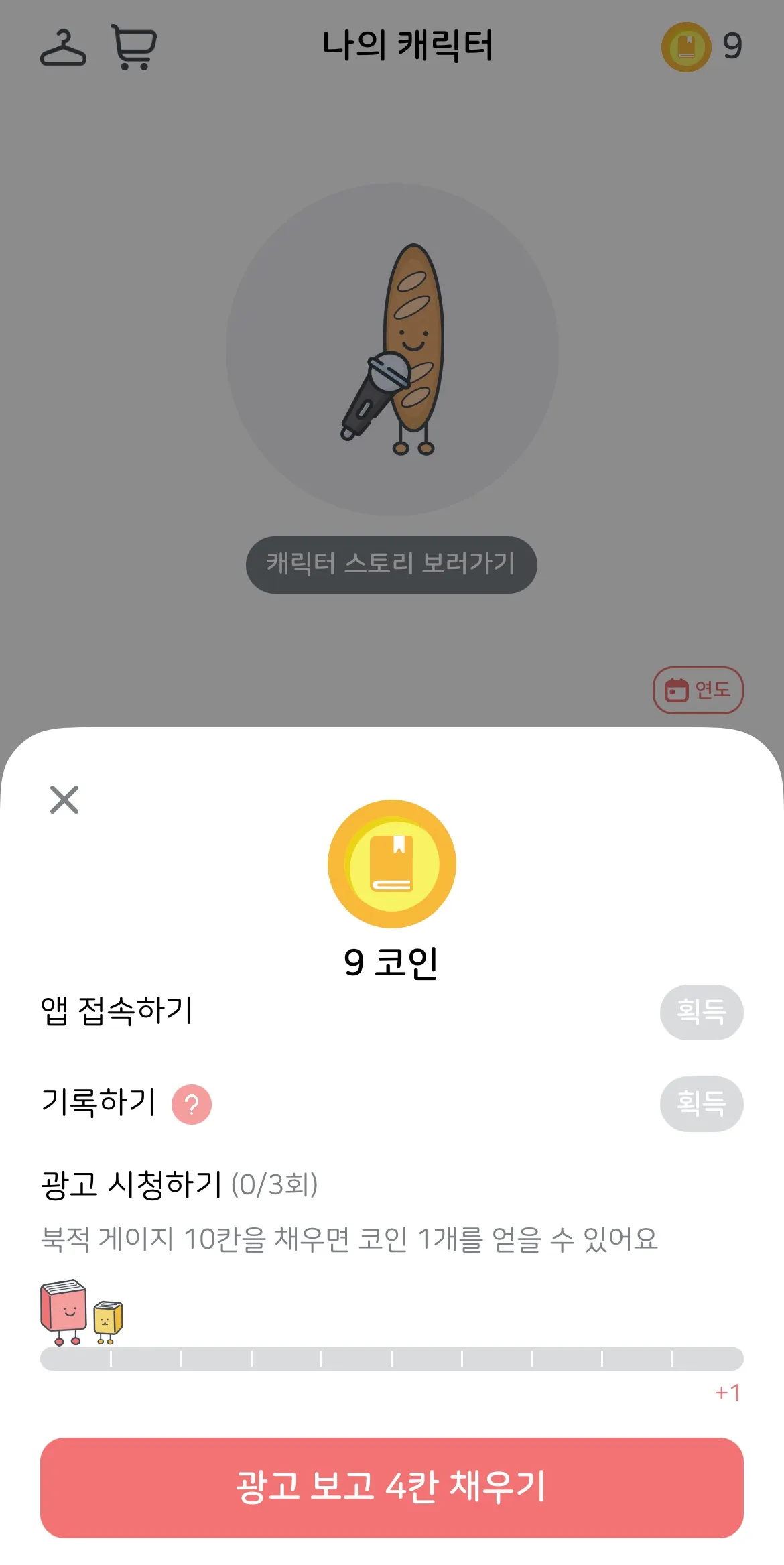 3. 광고 시청을 통해 북적 게이지를 10칸 채우면 코인 1개를 획득할 수 있어요