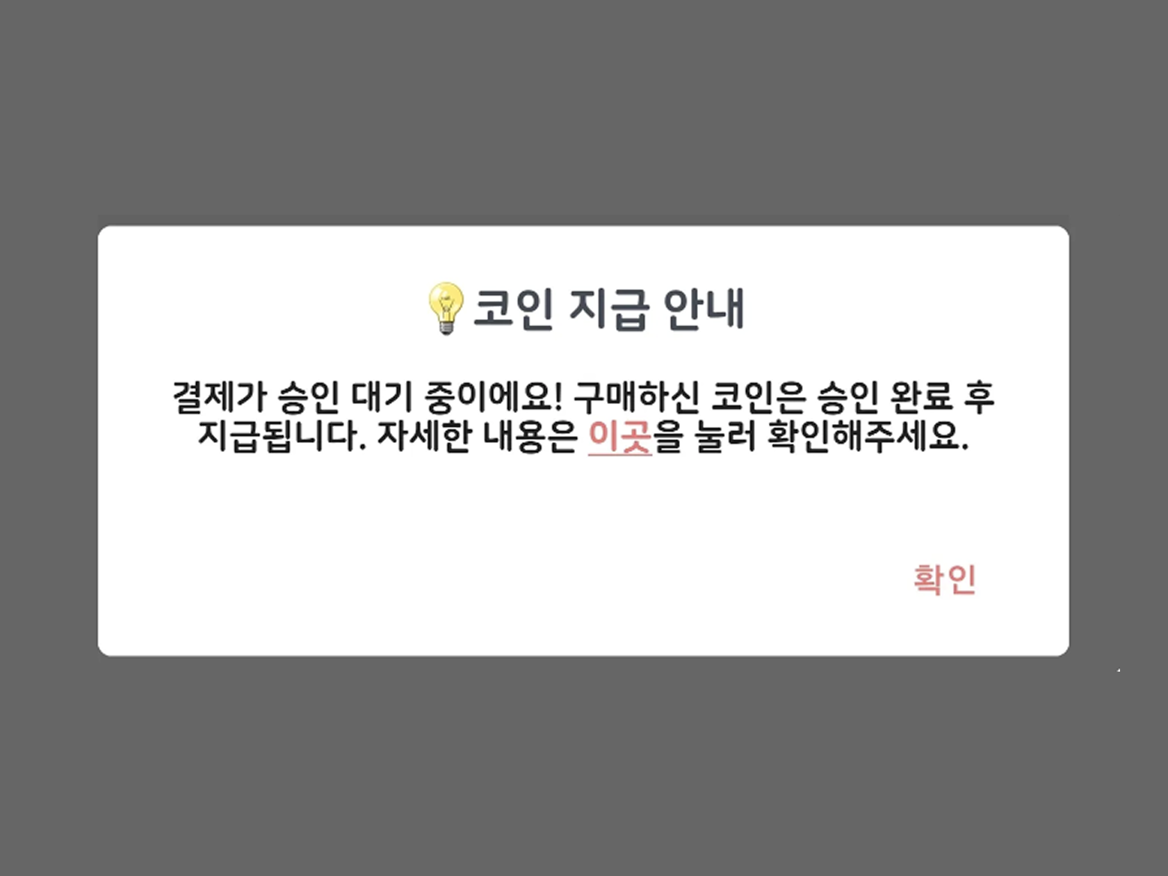 결제 승인 후에도 코인이 지급 되지 않을 시에는 결제 오류로 문의 해주세요.