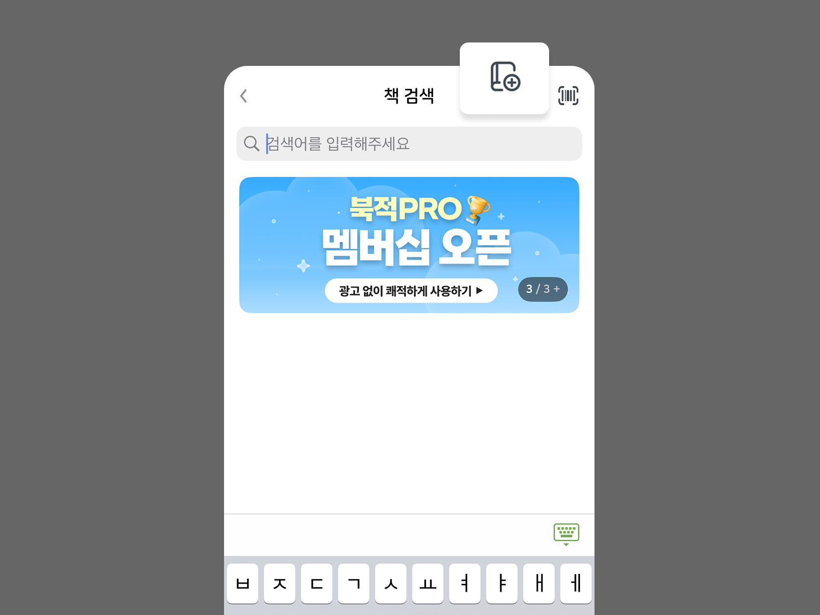 홈 탭 > 책 검색하기 화면 > 우측 상단의 + 버튼 을 통해 책 정보 직접 입력하기 메뉴를 사용하실 수 있어요.